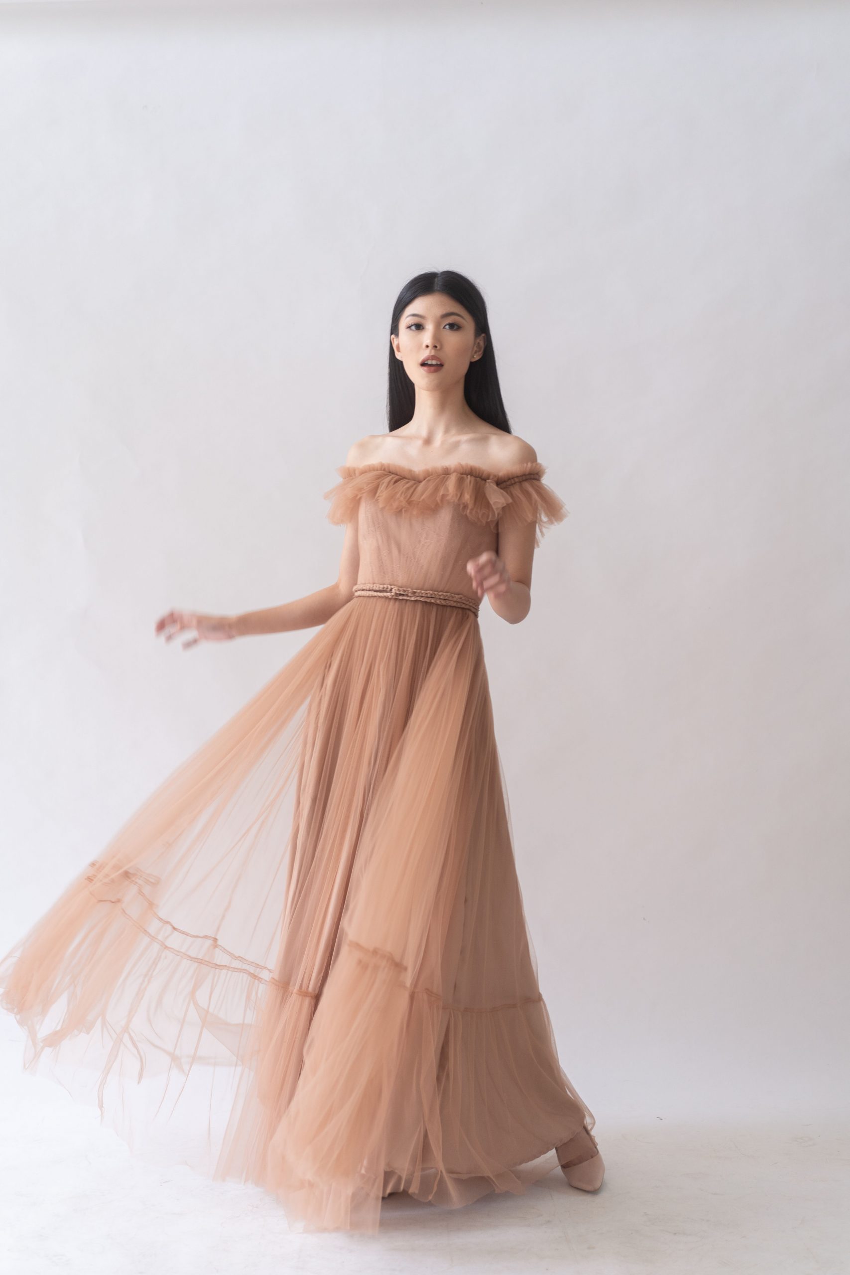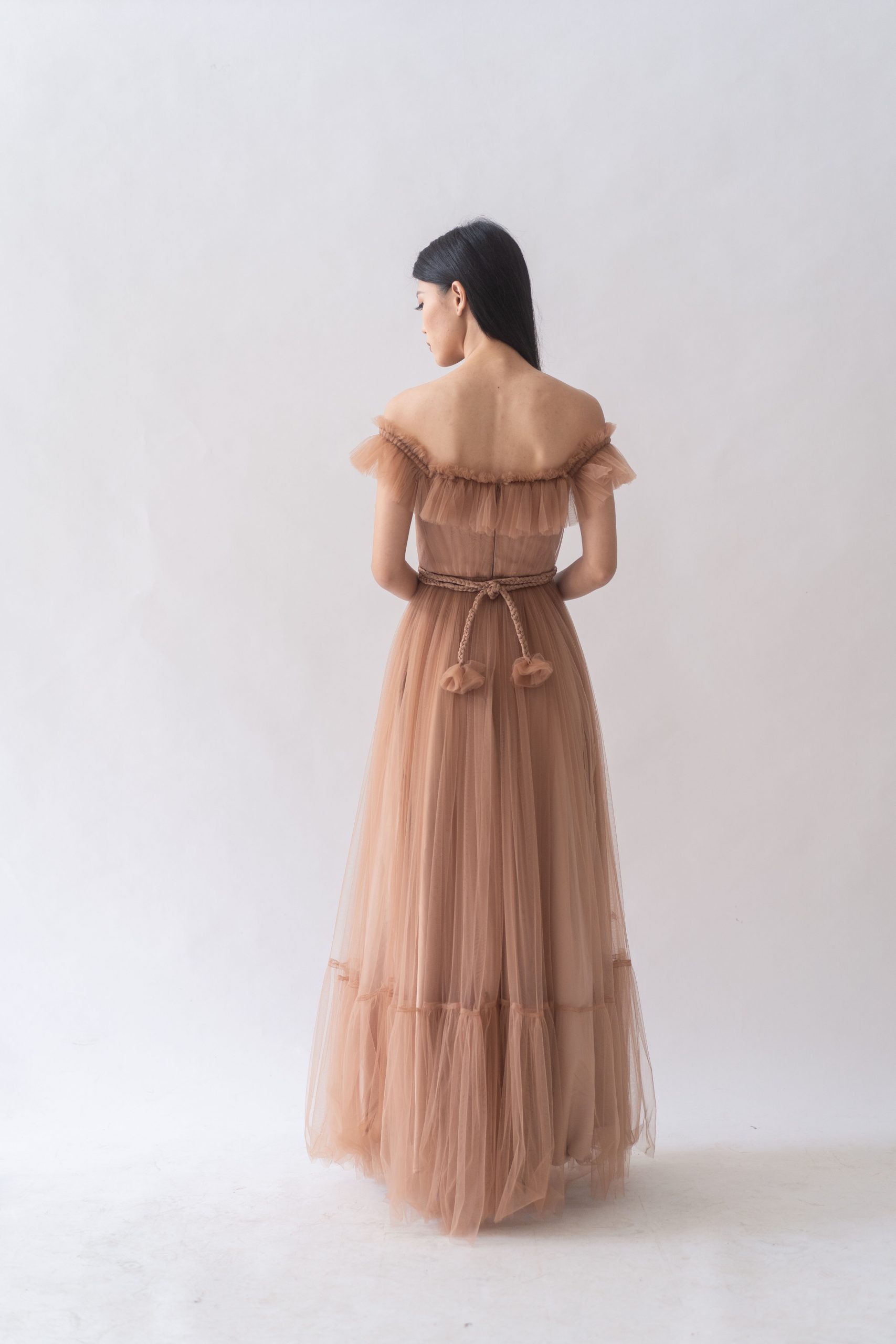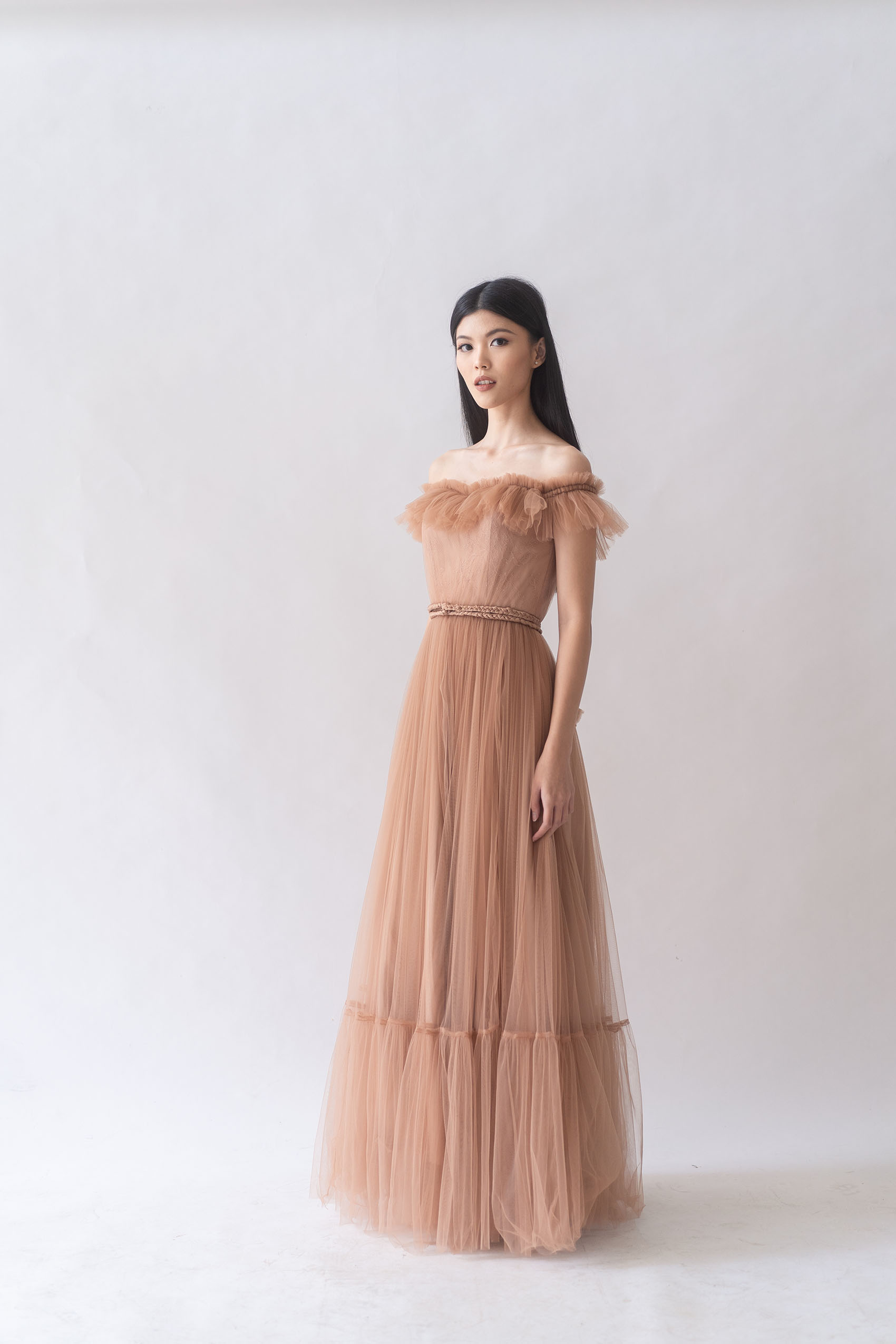 Material: Voluminous floor-length Tulle dress accented with frill trims that flutter around the off-the-shoulder neckline featuring tiered layered Tulle, with braided belt.